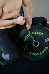Athletic man setting up weights with chains for strength training indoors.