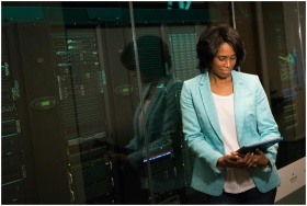 Female IT professional examining data servers in a
