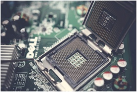 Detailed close-up shot of a computer motherboard featuring an open CPU socket and electronic components.