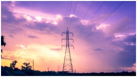 Silhouette of power lines at sunset against vibrant purple and orange sky.