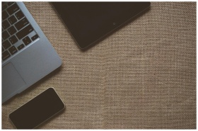 Flat lay image of laptop, tablet, and smartphone on a brown textured sackcloth surface.
