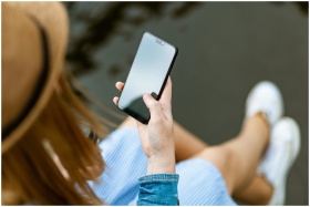 A young woman holding a smartphone while sitting outdoors in summer, capturing a moment of relaxation and technology use.