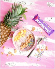 Colorful smoothie bowl with fresh pineapple, probiotics, and sprinkles on a pink background.