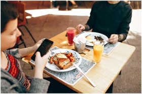 Two people enjoy brunch outdoors in Brazil, captured with a smartphone and Canon camera.