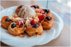 Tasty waffles topped with ice cream and fresh berries, perfect for a sweet breakfast.