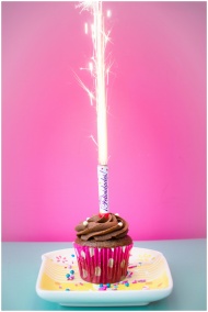 Colorful chocolate cupcake with a sparkling candle against a vibrant pink background.