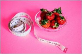 A glass bowl of fresh strawberries paired with a pink measuring tape symbolizes healthy eating.