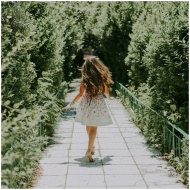 Back view of a woman in a sunlit park walking amidst lush green trees on a paved pathway.