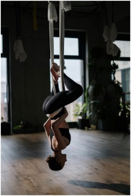 Woman practicing aerial yoga suspended from fabric