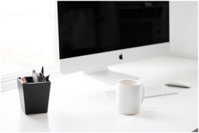 A minimalist work desk featuring a desktop computer, coffee mug, and office supplies.