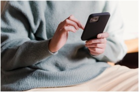 Crop faceless female in casual clothes using smartphone and touching screen while chilling at home