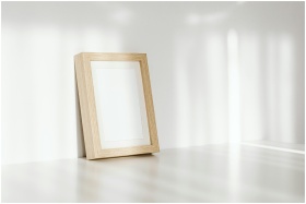 A close-up of an empty wooden photo frame leaning against a white sunlit wall.