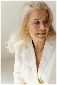 A graceful senior woman in a white blazer with gold jewelry, smiling softly.