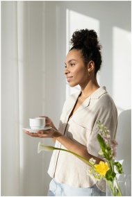 Smiling woman with curly hair holding a cup and saucer by a sunlit window indoors.