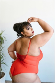 Empowering image of a plus-size woman in a red swi