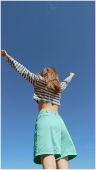A young woman raises her arms in joy, wearing a striped shirt and green shorts against a clear blue sky.