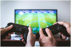 Close-up of hands holding gaming controllers in front of a TV. Engaged in a video gaming session.