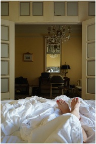Elegant bedroom with chandelier viewed from bed, o