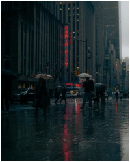 People walking with umbrellas in rain near Radio City, New York City at night.