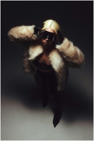 Fashionable woman in a glamorous fur coat and sunglasses posing in a studio setting.