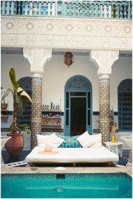 Elegant Moroccan courtyard featuring a luxurious pool and traditional decor.
