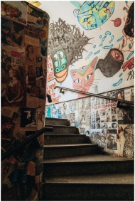 Vibrant street art covers the walls of a staircase