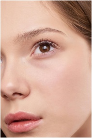 Close-up portrait capturing the natural beauty and smooth skin of a young woman.