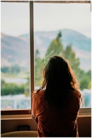 Silhouette of a woman looking out a window at a scenic mountain view in Cajamarca, Peru.