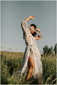 A woman poses gracefully in a sheer, flowing dress in a sunlit grassy field.