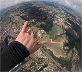 Aerial view of sprawling landscape with a hand making a gesture in the foreground.