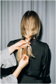 A person styling another's blonde hair during a cozy indoor pajama party.