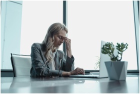 Professional woman in office, sitting at desk, looking stressed with laptop.