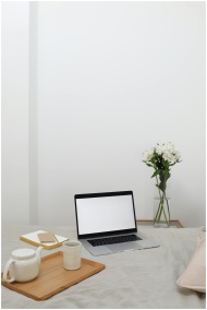 Wooden tray with tea set placed on comfortable bed near opened laptop and notebooks during remote work at home