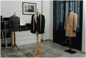 Stylish men's suits on mannequins in an atelier, s