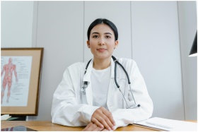 A female doctor confidently sits at her desk, read
