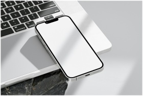 Close-up of a smartphone resting on a laptop with a blank screen for mockup use.