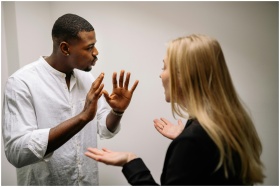 Frustrated coworkers in heated discussion, express