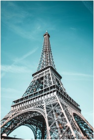 Stunning low angle view of the Eiffel Tower against a bright blue sky in Paris.
