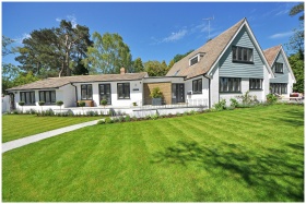 Contemporary house exterior with large manicured lawn and beautiful garden.