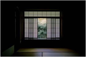 Serene view from a Japanese room through a shoji window to a tranquil garden.