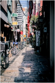Discover an empty urban alley in Osaka, Japan, featuring bicycles, narrow architecture, and light play on cobblestones.