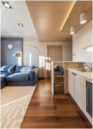 Contemporary living room with open kitchen and modern decor features ample lighting.