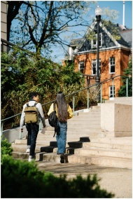 Two young adults walking up outdoor stairs surrounded by greenery and buildings.