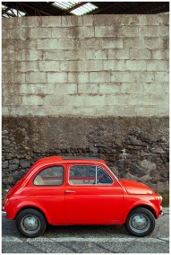 Classic red Fiat 500 parked against a rustic wall in Napoli, Italy, evokes retro charm.