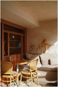Warm and inviting seating area with natural wood and soft lighting in Izmir apartment.