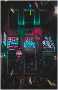 Dynamic neon-lit bar facade in Amsterdam's vibrant nightlife district.