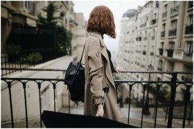 Woman in trench coat walking through a Parisian st