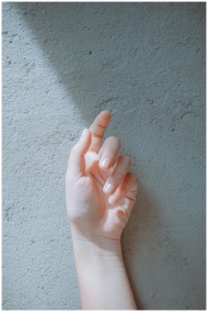 A hand is reaching towards a light against a textured wall, capturing shadows.