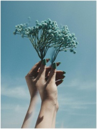 Artistic photo of hands holding a bouquet of flowers against the clear blue sky, creating a dreamy effect.