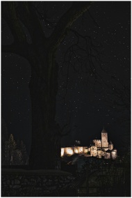 A beautifully illuminated castle set against a starry night sky, viewed from behind a large tree.